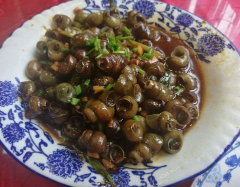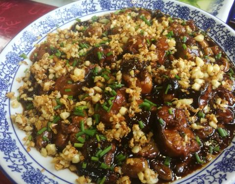 红烧生河鳗:浓油赤酱,上面铺上一层蒜丁,河鳗算小了点,酥、凝、肥厚占全了,拌饭特别好吃