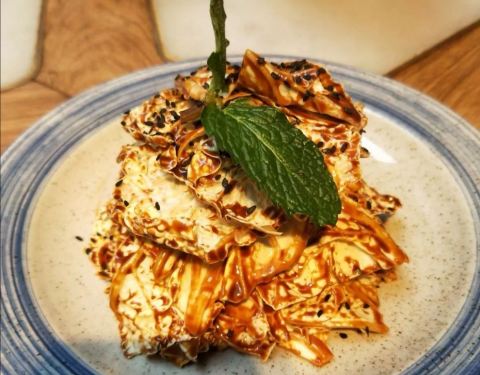 酥香烤鸭是使用枣木烤制,除了原本的烤制香味,还多了一层淡淡的木香,吃起来淡雅不腻。招牌的金甲大黄鱼是桌桌必点的,鱼肉炸的金黄酥香,造型十分巧妙,加上独家秘制的酱汁,再撒上面桂花,酸甜可口,回味悠长。