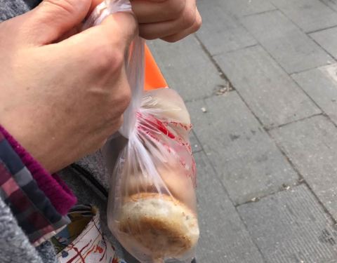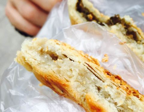...肉松,葱油的,2元到5元,价格不等,买酥饼的人络绎不绝,第一次买过,很好吃,临走,又来买了……