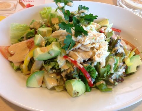 味もボリュームも納得のチキンアボカドサラダ619円。香味野菜ドレッシング(J'sドレッシング)がまた美味しい!