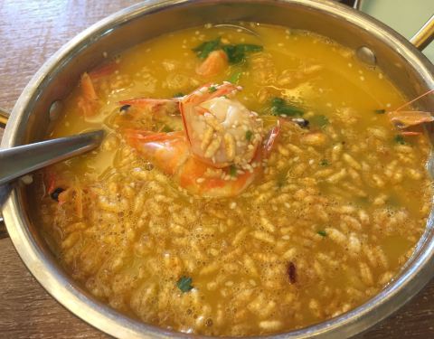 中午饭点想了很久都不知道想吃什么,嘴巴没味道,吃点鲜的吧,海鲜粥那是肯定鲜的啦,离我最近的就是唐宫了,去的时候正好不用等位。服务员热情招待入座点单,海鲜虾泡饭、整虾一切为二,挑去虾线与海鲜汁和米饭同煮,端上桌上再撒了半碗炒米,鲜。沙姜猪手,猪手去了大骨头,肉Q弹,拌的汁水也非常鲜香。