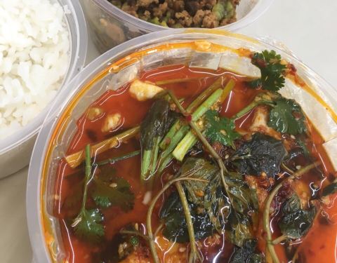 一个人吃个简餐,附近叫了这家月亮湾的云海肴,外卖有满多少减多少的活动,送餐小哥也很给力,很快就送来了。包装还可以,没有漏。但是小份的杨林酸菜鱼里的土豆条都是生的,怎么吃?鱼片是龙利鱼,油了点。黑三剁店里吃里面好像有红辣椒的,外卖送来的味道和店里不一样,不好吃。米饭还可以,满满一碗。