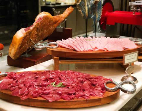 可以睡到自然醒的周末,笃悠悠地起床出门吃个Sunny Brunch。思聪家的Brunch有点不一样~ 万达瑞华酒店一层,环境是老上海复古风,旧辰光的青蓝色丝绒窗帘、老上海照片、丝绒靠垫,窝在椅子里慢慢享受周末的早午餐。 刺身绝对新鲜,扇贝刺身、三文鱼刺身、北极贝,都要吃上两轮才过瘾。尤其喜欢肥美的三文鱼和清甜的贝柱。 火腿除了有常见的几款,还有现切的伊比利亚火腿,配上旁边水果区的蜜瓜,瞬间穿越到了西班牙。 这里有独有的叻沙和冬阴功味道的小龙虾,饱满的虾肉,独特东南亚风味,让原滋原味的小龙虾更多了一丝新鲜感。 白芦笋和芝麻菜搭配,当季的白芦笋清新自然,口感嫩滑爽脆,不时不食~ 独创惠灵顿鹅肝羊排,在惠灵顿牛排的基础上加以改进,松脆酥皮里包裹着鲜嫩诱人的羊肉和入口即化的大块鲜嫩鹅肝,口感层次分明又相互辉映。 大块牛脸肉是自助餐里比较少见的,喜欢吃的孩纸别错过。 和外面的自助餐不一样的地方是,周日早午餐还特别适合带小朋友来,有专门的儿童书画室哦,书画室里用品齐备,还有特供的儿童餐。 用美食叫醒周末的慵懒神经。