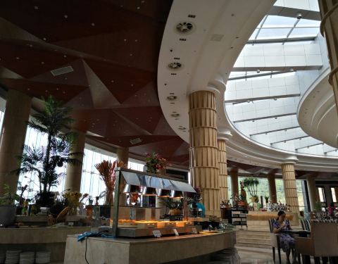 吃的138的自助餐,还挺好的,大概有二十到三十个热菜,三文鱼,虾子,铁板牛排鸡排,米粉水饺都有,各种饮料和甜点,热菜主要是牛腩和鸡脚汤比较喜欢。美团108一个人。在景区能这样就不错了。