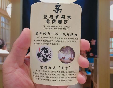 #曲江银泰店#晚上和朋友来大唐不夜城步行街逛,然后准备在银泰城解决晚饭,A馆比B馆餐稍微能多点。而且还有一个袁家村美食城,但是瞄了一眼人实在太多了,而且位置紧张,真要走的时候看到这个烤肉,一看是九田家,在西安门店挺多的,于是直接进来尝尝。每桌会给提供一瓶农夫山泉水和茶叶一包,后面再加需要收费。让店里小哥给推荐了一下,比较喜欢吃牛肉,最后点一份牛肋条和一饱口福牛肉,朋友给自己点了猪五花,上菜很快,服务员先给烤一下。后面需要自己动手烤了,更换烤盘很及时。总体烤肉味道不错,服务也好!
