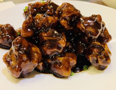- 鲜美细嫩的大黄鱼上铺着一层年糕,年糕吸足了鱼汤十分入味,令人念念不忘。 糖醋排骨我就不太喜欢了