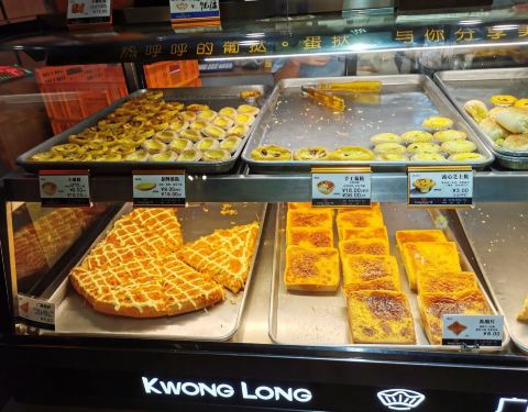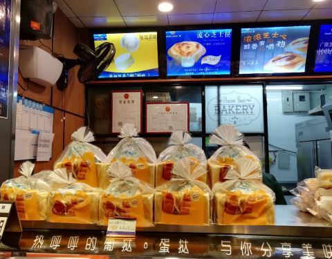 广隆蛋挞王在区庄众多食店中最有洋味,无论是其产品、店内众多地道的英语,还是其名字的粤语味英译。吐司等标明生产日期,均为当日新鲜制作。