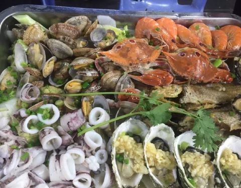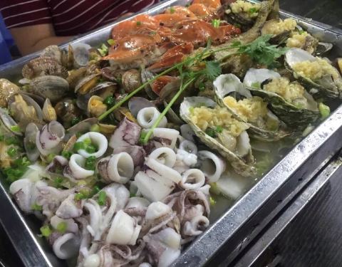 在洪文大排档里面,如果从沃尔玛停车场过来,直直走就是了。两个人点了一份海鲜盘,分量实在不错,有鲜虾,肉质很q,非常新鲜。有鲍鱼,数量有五个。有生蚝,蒜末很多,蒜香很香。花蛤就更多了,非常多的花蛤,有小墨鱼。底下的素菜真是太赞了,花菜和白菜都很甜。还有炸过的小杂鱼。整盘都非常适合下饭,能吃辣的话,还是要有点辣比较好吃~