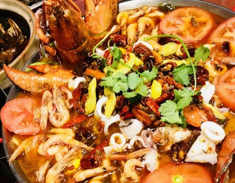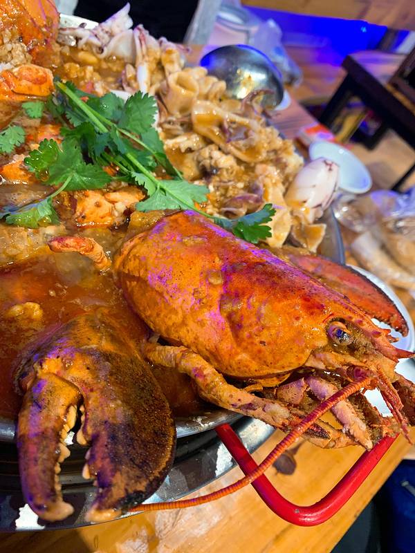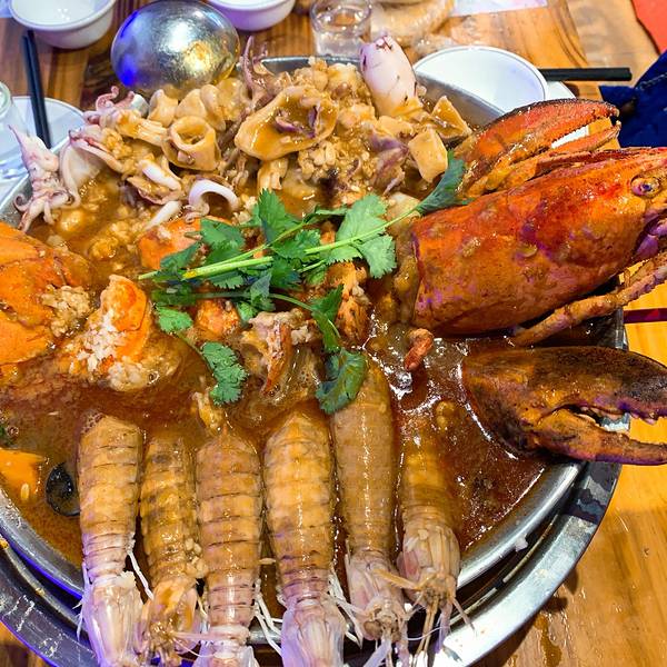 ...烧」一大头龙虾摆在中间,搭配了扇贝、鱿鱼、芋头鱼丸,再用厦门人喜爱的沙茶和蒜蓉一起煮,口感丰富