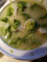 中午不想吃单位食堂,改善伙食吃水饺。去了单位边上的董鲜生,在杭州大厦D座5楼。点了一份黄瓜鸡蛋虾仁水饺,要求做汤饺。送了茉莉花茶,很香。水饺皮是绿色的,很可爱,用老母鸡熬出来的汤,很鲜美,水饺个头很大,一份有12个,一个人都吃不完。