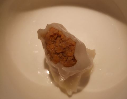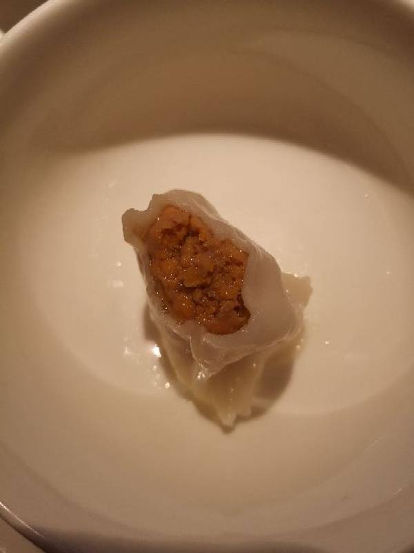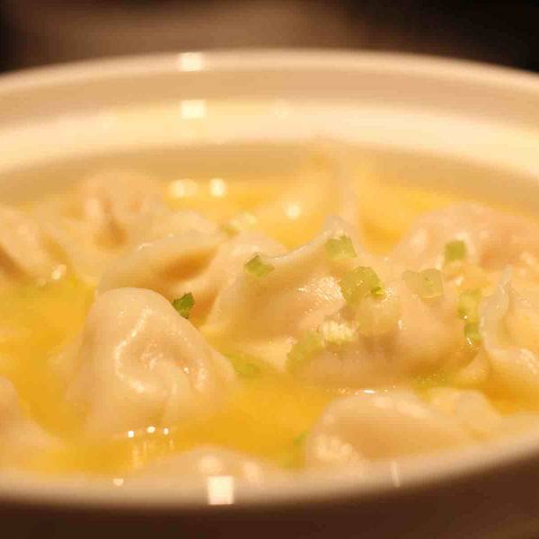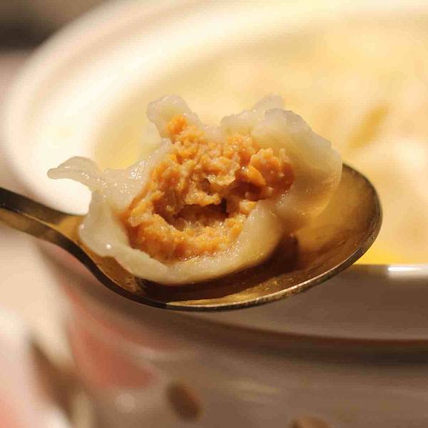 |海胆水饺^董鲜生招牌,炖着温热的鸡汤,海胆馅料搭配鸡汤,鲜美得神采飞扬。不过必须热的时候吃,冷了有点腥气。