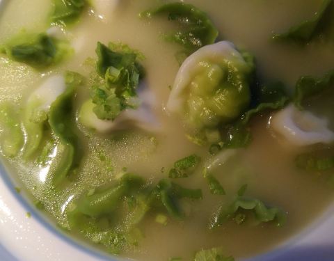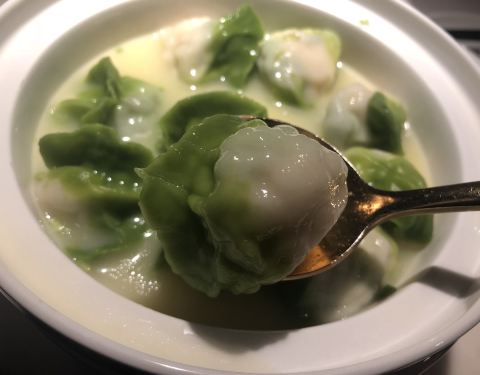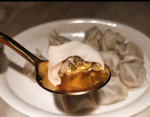 - 水饺皮是绿色的,很可爱,用老母鸡熬出来的汤,很鲜美,水饺个头很大,一份有12个,一个人都吃不完