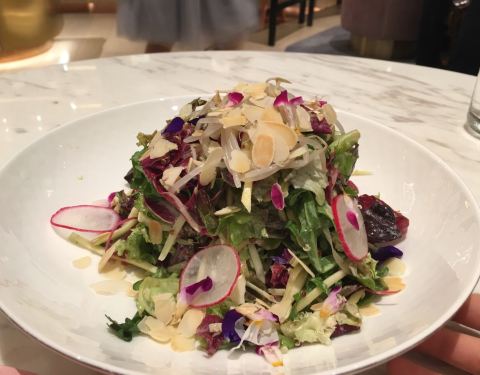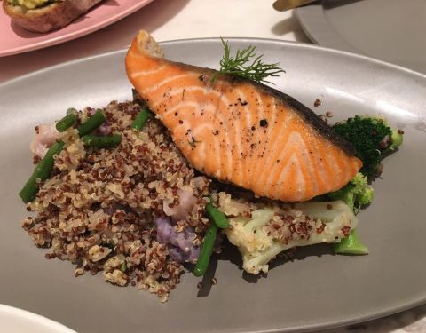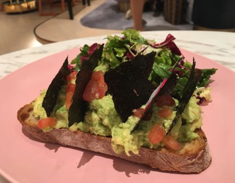 一个浪漫小女人的餐厅。整体色调是粉红色的,满眼的鲜花,粉色的装饰,从餐具到摆设的细节都散发的香甜的感觉。下午茶用餐时间有十多个人排队呢。真是火热的不行。排到了午茶时间快过了,直接吃的正餐。各种菜品颜色漂亮,食材新鲜健康。这个牛油果面包不错,面包酥脆,牛油果野菜沙拉调的味道清新可口。三文鱼肉制很好!