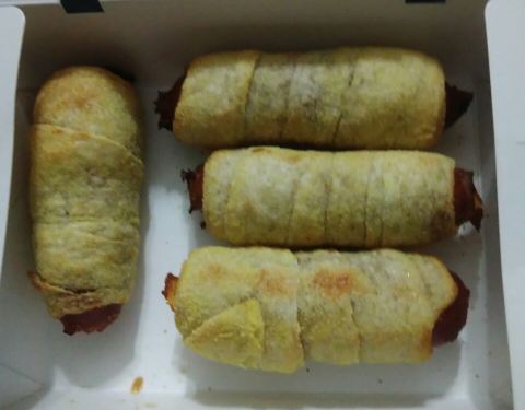 达美乐的培根土豆比萨没有吃过,也来试试,实际与想象的有点出入,培根不多,土豆都是薯角,中间的美乃滋感觉像炒蛋。面包热狗卷有点出乎意料,除了外面裹的一层面包,里面是十足的热狗肠,很实在的一根。