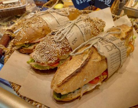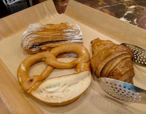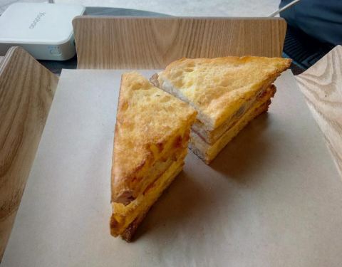 南京的红跑车开到杭州来了,下午特地拐过来尝鲜。其实是被朋友推荐过来的,这才特地换了三辆公交车,从余杭良渚那边赶过来。想想来一趟也不容易,所以各种类型的面包都买了一点尝尝。估计店员没见识过吃货探店的精神,把我们误会成其他面包店派来的探子,也是囧然。 说实在的,杭州的大部分面包店基本都吃过了,现在热衷于去上海买面包吃,要探虚实真不用来这儿探。另外,也别总推销办卡,还没吃过就要我办卡,怎么可能会办?面包好吃自然会有回头客,不用说也会来办的,加上还有显眼的办卡优惠公告牌。 话归正题,先说说这儿的面包,种类格外丰富,涵盖面广,基本款该有的都有了。点的原味可颂,让服务员帮忙切了一下,手法生涩,建议多多练习,切面包基本都切小块比较好。 可颂口感很不错,很酥,吃着有弹性有张力,味道不错基本满意,挺好的;至于巧克力味的可颂,其实更喜欢作为内陷,那种吃着流心的巧克力可颂。 可颂吃完之后,再挑了一个普雷结,海盐口感。作为德国碱水面包,外形一般,颜色太浅了,不够红亮,吃着没有想象中的柔软中带着韧性的那种感觉,也不用期待两头会有焦脆的口感,不怎么推荐。 第三款巧克力酥,带着拿破仑的那种口感,层层叠叠的酥皮让我很喜欢,巧克力酱带来的口感也很不错,推荐~ 这边的三明治,有四种不同类型。第一种是放在面包区,外面裹上蛋液,内陷很丰富,双层不同口味的内陷儿,味道不错,建议不要加热,加热之后的面包口感就变差了,反而直接吃会更好一点;第二种是冷藏柜里,包装好的鸡蛋吞拿鱼三明治,配白土司,馅料够多,适合买回去当早饭;第三种虽然也在冷藏柜里,但卖相最好,用粗绳子绑着,因为块头太大,感觉买了吃不下,下次再来过。最后一种就是普通的小三明治,无需多言。 蛋糕方面,为了安全起见,选了一个最能体现蛋糕口感的淡奶小方。买的时候记得千万注意看生产日期,最好挑当天出品。蛋糕胚本身不错,吃着绵软,但是上面的奶油太一般了,吃着有那么点腻,不是很喜欢。 临走前再试了一下肉松酥和奶酥,记得上面有黑芝麻的是甜味的奶酥,没芝麻的则是咸味的肉松酥。上面的酥皮口感偏硬,馅料藏在底层的面包里,存在感太弱了。 最后,一般面包店都会有小片的试吃,方便顾客尝味道选择面包,下午过来的时候没发现有,据说晚上才会有?