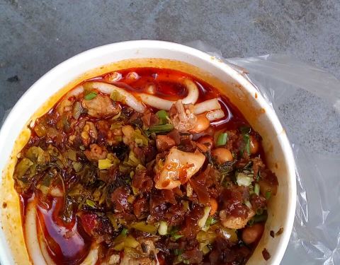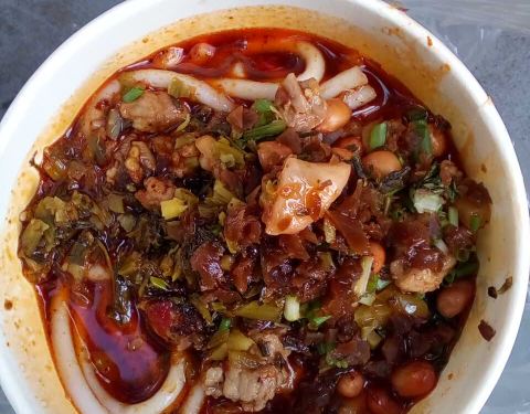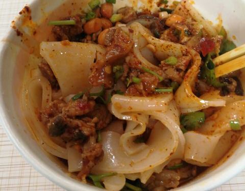 吃的不是米皮,俺选了馄饨――小碗8元。终于不用顿顿吃粉面了,本来想吃饺子,却只发现馄饨,但样子与口感吃起来也像饺子。幸亏店家主动问俺是否放辣,否则红油一碗汤!
