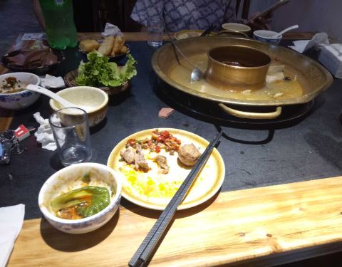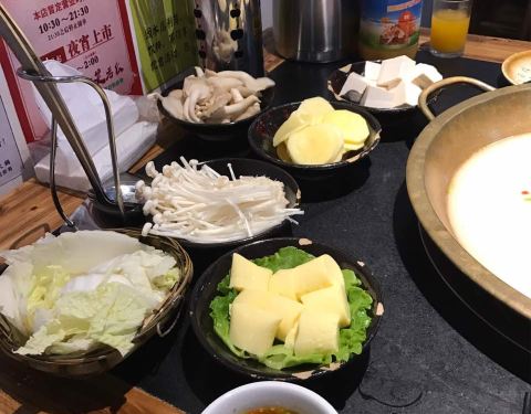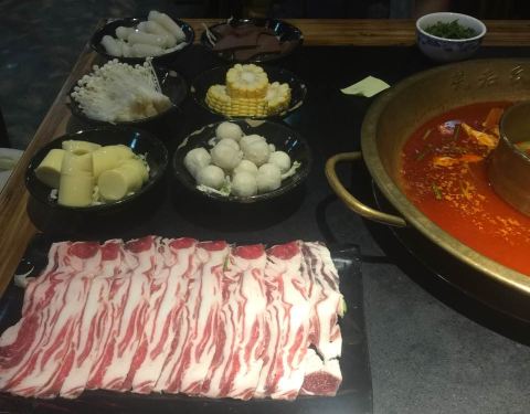 鸭血口感很好,虾滑有点鲜甜。菜式原材料新鲜,鸳鸯锅是三式:菌菇、番茄、麻辣各三分之一