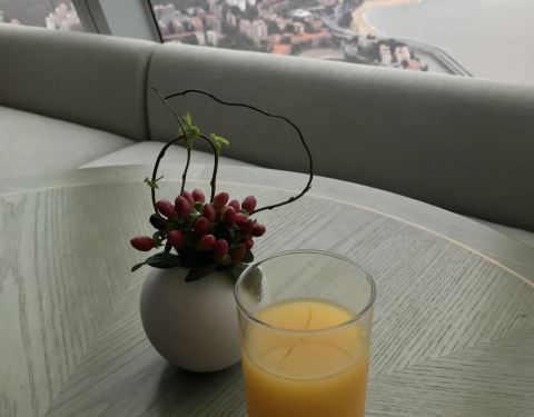 位于酒店54层的海岸行政酒廊,可办理行政房退房手续,因为时间尚早,顺便坐坐,喝些东西。非下午茶时间,所以台面基本是空的,冰箱内有各种饮品,工作人员服务都很热情、细致。酒廊窗边座位刚好看到厦大全景,比...