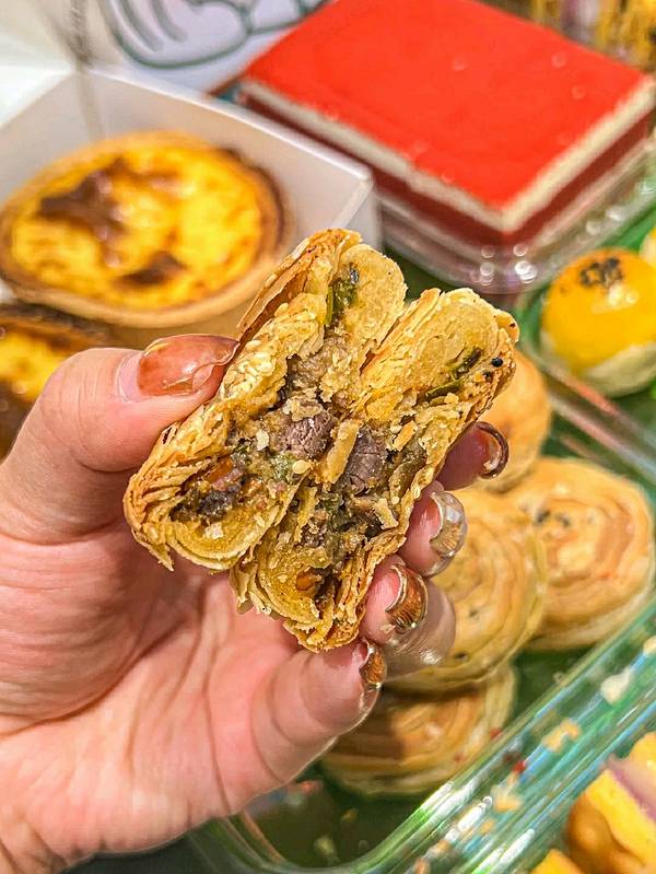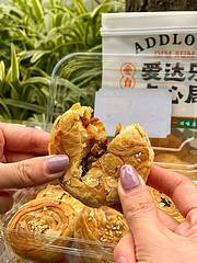 【小盔酥】 手工制作现场烤制的点心,外皮酥脆,内里肉香味十足[强]一共有两个口味,川菜大师特调的椒麻牛肉和梅干菜鲜肉!吃起来咸香可口,我一个人就能炫完一整盒