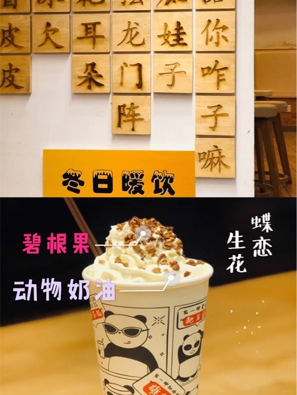 一座独立的小院子,不仅仅好看,还很好休息,里面是有沙发位置的,整体环境还不错,有成都德特色; 🎈装饰物是蜀都特色,大熊猫🐼还是被涂鸦的大熊猫,很可爱啊,喜欢这个杯子; 店铺原木风,这种设计很感人,简约亲近大自然,外面里面都有可以休息的椅子💺 🌟服务:小姐姐、小哥哥态度都很好,制作很速度; 💎店铺:蜀色茶颜(奎星楼店) 📍坐标:奎星楼街16号附4 🚇交通:地铁宽窄巷子地铁站/可以小单车,这里就是小单车聚集地 ⏰营业时间:10:00-22:00 💵人均:¥15.00 「蝶恋生花」🌟🌟🌟🌟🌟 虽然说奶味比较生重 但是整体还是比较好喝的,尤其是碧根果搭配了甜甜的奶油,清香的红茶很好喝;