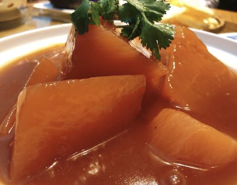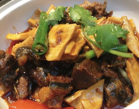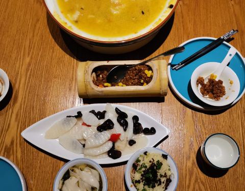 晶泽雅厨是杜甫草堂附近很有名气的中餐厅,尤其是招牌首创人生果狮子头是很多人都安利的新派川菜,这次我们来就是为了狮子头来的[呲牙]。狮子头用一个大盘子装着的,盘子下面还有连着一个瓷盆烤着小火,保证狮子头不冷不变形。大概上桌几分钟后就有店员小哥戴着手套帮忙把狮子头切开,切成一块一块的才方便好舀。狮子头里有鱼有虾有人参果等,口味清淡富有营养,汤汁鲜美好喝,不愧为创新招牌菜。小份的腊味竹筒饭就够两个人吃了,里面还有玉米,味道不错。我们还点了3种口味的面食各来一碗,而且请店家再加点油泼辣子时,厨师和服务员都很大方地帮我们再泼了辣子,态度非常好的。最赞的是餐具是用放在专门的高温蒸汽盒里高温消毒,服务员也是当着我们的面戴着手套拿出来了,卫生方面做的太好了!