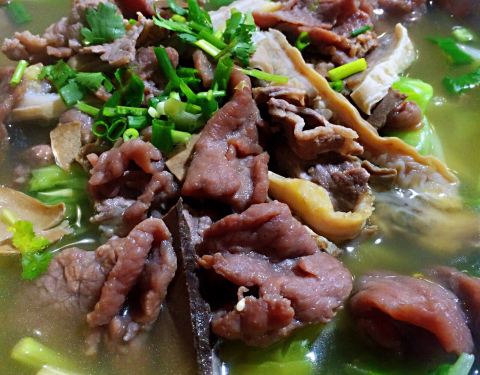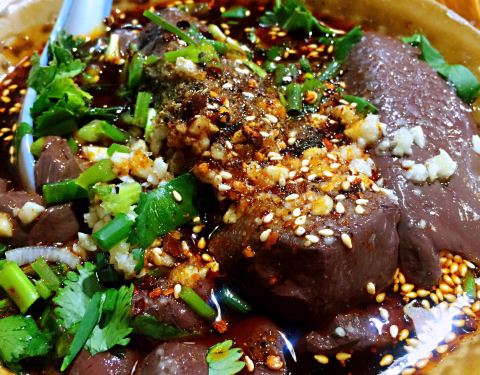 乐山的跷脚牛肉要去苏稽镇吃才正宗 那又是奔波的一餐...不适合中毒的我们... 这家饭点儿爆满 全是本地人 推荐! 牛血旺好嫩!牛肉牛杂好嫩!