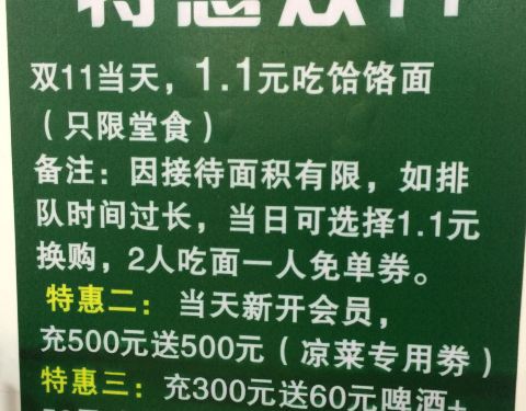 - ...现双十一当天吃面一块一一碗,这活动太给力,就是不知道会不会有时间过来需要拍很久的队,给活动点赞