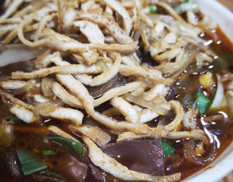 ...郏县薛店镇,主材料就是豆腐丝和本地粉条,浇上羊肉汤,放葱花香菜和本地特产羊油辣椒油,味道棒极了
