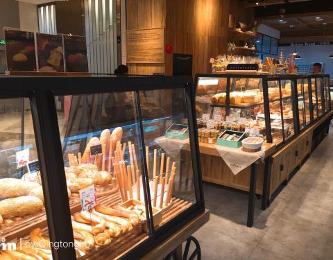 工匠面包在壹方购物中心的三楼,开放式的店面宽敞明亮干净整洁,新鲜出炉的面包整齐摆放在货柜里。红丝绒蛋糕的颜值口感都不错。