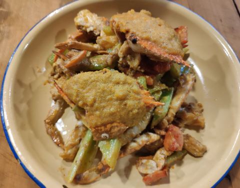 之前看网上推荐这家祥和里店就一直想去拔草,但是看群众说要排队很久就没有去。最近发现这家店在马鞍路开了分店,就选了下午五点多早早过去。去的时候人还不多,很顺利的就找到位置。 环境:就是一个独立的小院子...之前看网上推荐这家祥和里店就一直想去拔草,但是看群众说要排队很久就没有去。最近发现这家店在马鞍路开了分店,就选了下午五点多早早过去。去的时候人还不多,很顺利的就找到位置。 环境:就是一个独立的小院子,装修很普通。 服务:员工动作快,看得出来心情好,还一边忙一边唱歌,老板应该对员工很好。点菜需要自己扫二维码在手机上操作,很方便。 菜品:咸蛋黄炒蟹里面的蟹壳炸得脆脆的,蟹很新鲜。咸蛋黄裹在蟹肉上很提味,不愧是群众推荐菜。 宫爆虾球里面的虾处理得很干净,虾也较大,带点酸酸甜甜的口感。 爆炒蛏子较辣很够味,不能吃辣的谨慎尝试。 蟹蟹面是糖醋味的,下面有很大一碗面,够三四个人吃。我不是很喜欢糖醋味,所以觉得一般。 总体觉得还是可以的,喜欢吃海鲜的朋友一定来尝尝。
