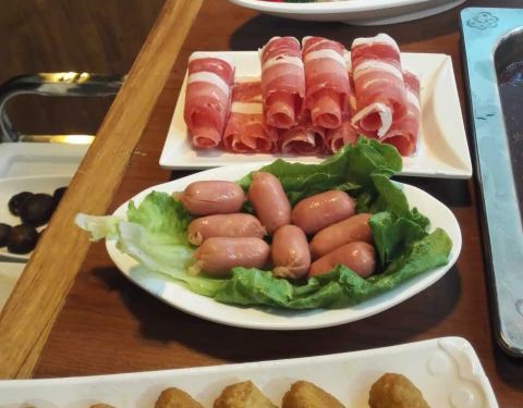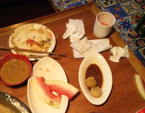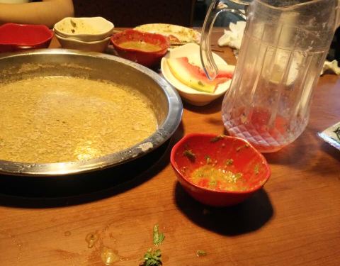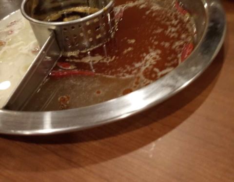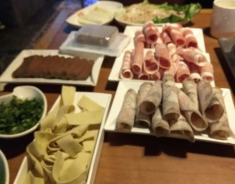 两盘牛肉 一盘虾滑 一份龙虾丸一扎西瓜汁 两个人 一片狼藉