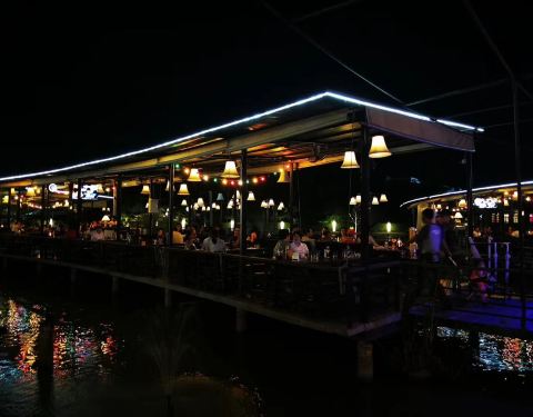 傍晚坐在河边看看夕阳,品尝美食,坐的晚了直接饭店变酒吧,地方非常大,环境很好,有乐队表演,感觉很有情调。味道好极了,非常喜欢。