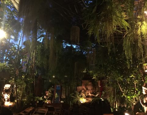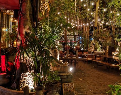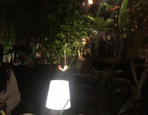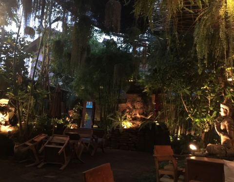 这个地方真的是大隐隐于市,里面只有一片天地跟空间好像就在一个大的庭院里面吃饭一样,也是一个晚上比较热闹的吧,里面就热带雨林的风格,旁边就是热热闹闹的城门,在这里吃东西,虽然比较贵,但是真的是很有意思的地方,朋友相当喜欢这里面的小吊灯,显得非常的浪漫。