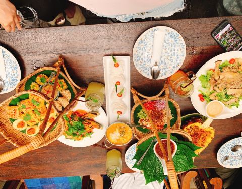 本来想去吊脚楼那家网红 然后居然19 20号关门 没办法只能又找了附近这家 没想到小小的门进去居然别有洞天 里面装修让人感觉在树林中的餐厅 大中午的居然很凉爽这家中午1点才会开始营业竹篮子是特色 看上去很有意思 但是竹篮子的东西都不好吃诶不过其他的菜味道都还不错 菠萝炒饭 蘑菇沙拉 芒果糯米饭什么的都可以记得 他们点白水给你上的是矿泉水 现开的 所以我觉得应该是要钱的吧