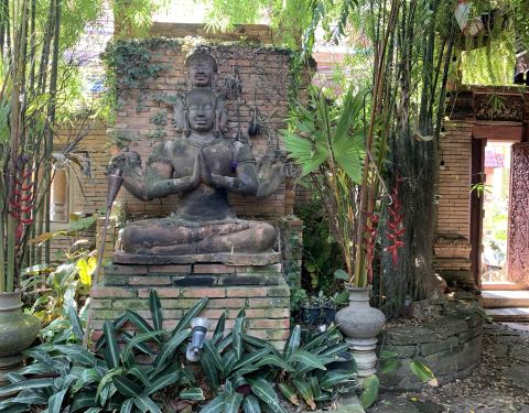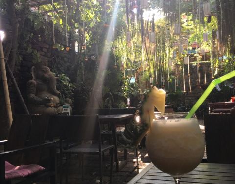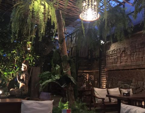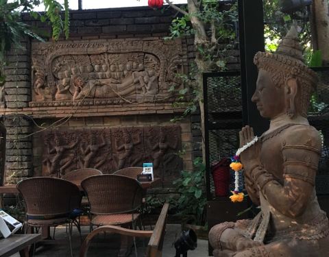 当你第一眼发现这家咖啡馆,就会被深深的吸引,这是清迈古城里浓浓的吴哥情怀,高大的树木,郁郁葱葱的灌木丛,数不尽的佛脸石刻雕塑,点杯咖啡来份美食,度过安静的时光。