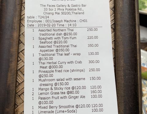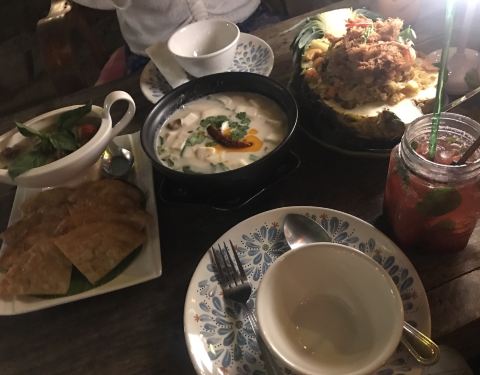 我非常满意这家店。 【口味】点了椰汁鸡汤和菠萝炒饭,绿咖喱,分量足,非常好吃。饮品是点了泰式奶茶和莫吉托,嗯哼,我喜欢 【环境】环境不要太有调调哦!外面看着像古庙,进去后,漫天星,放着舒缓的音乐,1月的清迈,吹个小风,喝个小酒,听着音乐,太舒服了 【服务】英文交流,对我来说没有问题,店里西方老外居多。人均一百➕吧