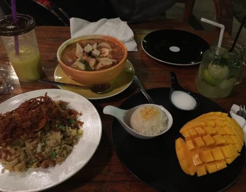 冬阴功汤还行,菠萝海鲜炒饭量少味道一般,芒果糯米椰汁饭分量少,服务挺好的没有服务费还是给了小费,因为还在装修过程中,有点乱乱的,价格相比其他店有点贵了,环境还算不错小资情调拍拍照挺不错的选择。mojito难喝不要点,糖都没溶解,太酸了青柠汁放太多,没有太多朗姆酒的味道不知道是不是比例问题,可能我喜欢比较浓烈的mojito……