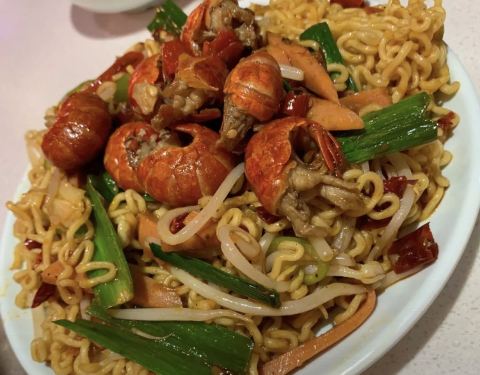 这是我第一次吃龙虾炒方便面,味道很香,炒的很干爽,是我喜欢的口味,龙虾肉也是咸鲜嫩嫩,一点都不老嘛,很好吃!服务态度好的!