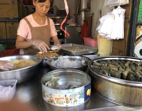 泉州的手工麻糍蛮有名的,我是糯米星人,但是因为老家的麻糍已经非常好吃,且非常特别,特别到外地都没有了,所以我到外面玩看到手工麻糍并不会有太大兴趣,大部分都是那种一颗颗的,沾点黄豆粉的那种,所以一开始我就没打算吃。 可是…(真香)因为这家店一直一直从我眼前晃过,我去开元寺,路过,开元寺回酒店,路过,去买满煎糕、去小西埕,去钟楼,都路过,总之,因为它就处于酒店到西街的交叉口,所以看得我实在心痒痒,难得这次路过居然没几个人排队,我就去买了。 居然还真不是我想象中的,反倒是有几分特别的麻糍。阿姨挺累的,因为一直亲手在给麻糍包馅,里面的脆片脆脆的,配上芝麻白糖,包着糯米,外面再裹一层粉,你别说,还真挺好吃的,而且很清淡,不会很甜的那种。 他家还有秦粿,我不知道为啥叫这个名,就是粽叶里面包了粿,很古早的味道,很像小时候吃的某种糕,吃多了会有点腻。