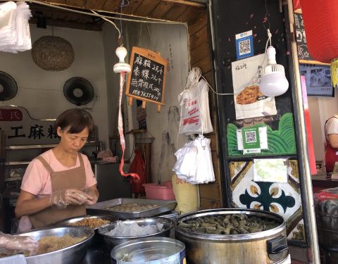 对于糯米星人来说,怎么能错过这么好吃的麻糍! 吴氏手工麻糍,位于泉州最古老的西街上。小小的门面,门口排着长长的队伍。老夫妻一起经营,一个包麻糍,一个帮忙收钱、打包,配合很是默契。 店里只卖三样东西:麻糍、秦粿和无骨凤爪。不过大家几乎都是奔着麻糍来的。 麻糍,2元一个,5个起配盒子。 糯米皮很糯很Q,里面包着芝麻粉和脆饼,外面裹上花生粉,不太甜,很好吃。
