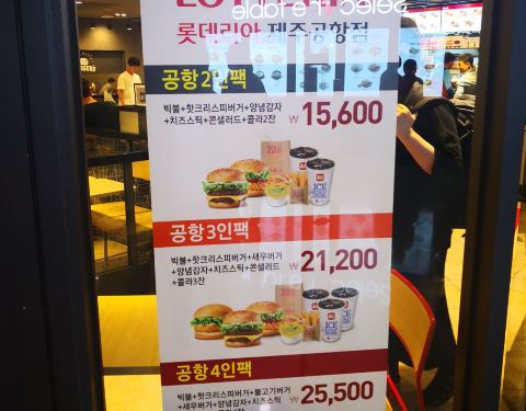 lorreria韩国本土的汉堡店,济州机场国内线电梯到四楼美食广场最里面的地方,门口有推荐的2人餐3人餐和4人餐,当然是4人餐性价比最高,我们直接点了这个套餐,后来才发现真的赚了,过了安检以后没有吃饭的餐厅