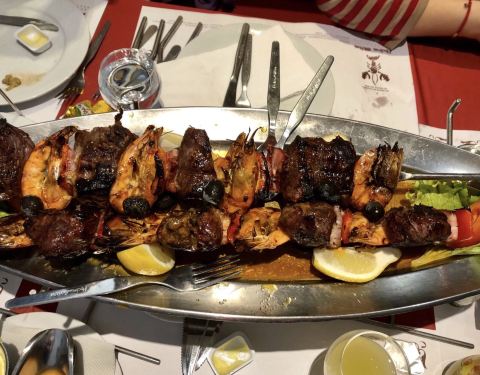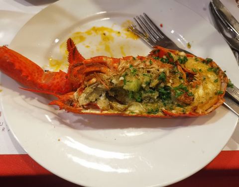 这是其中一家,以大份量海鲜闻名,餐前面包颇硬,会嚼到咀嚼肌酸,普普通通吧,推荐一个自制格栅算是套餐,62.5欧元,份量2个人吃就很够,有2只已剖好的龙虾,5只(去壳)小虾,