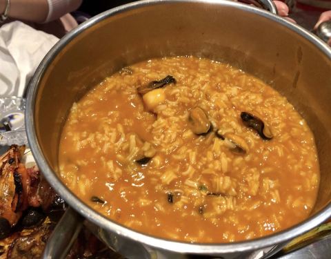 海鲜拼盘 直接看叉子的尺寸就知道这个小份的拼盘有多大,里面有龙虾,螃蟹,青口,大虾,鱿鱼,牛肉串 大块的牛肉,虾,培根.海鲜粥 应该是和海鲜拼盘一起的,别看其貌不扬,喝起来超级爽的好嘛!