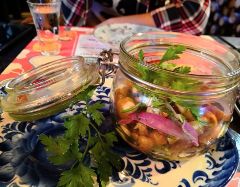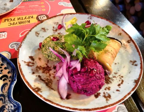 格鲁吉亚包子是水煮的,四种口味:羊肉、蘑菇、奶酪、鸡肉,可以拼一盘,味道一般,因为是煮的,所以吃起来像灌汤包。蘑菇冷菜很好吃,有点酸酸的。最好看的最难吃,感觉就是各种酱的拼盘。胡萝卜蛋糕还不错。环境很好,人多需要提前预订。