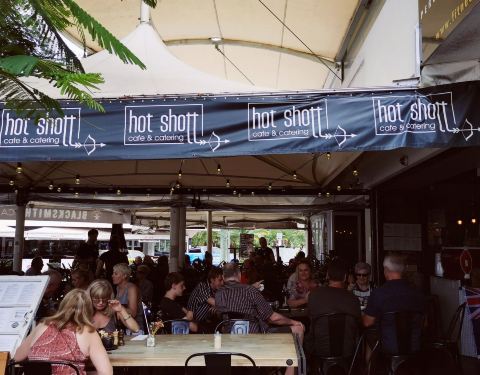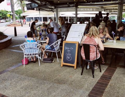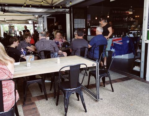 ...一家,露天茶座上每张桌子上都插满了澳洲的国旗,顾客也是比较休闲的在吃简餐,不过吸烟的顾客比较多