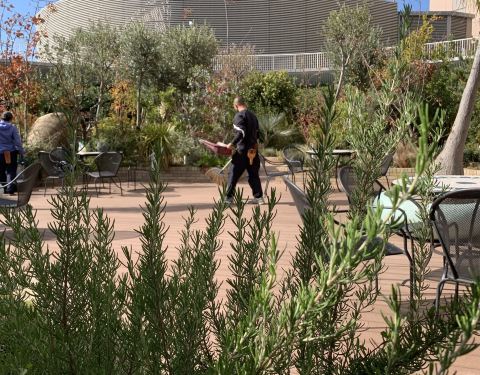 屋頂花園餐廳,環境超棒,服務差些,不會英文,一兩位勉強可以。東西好吃,面包超好吃,牛排也是。中午神戶牛套餐超性價比。值得排隊。女士多。