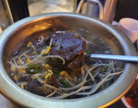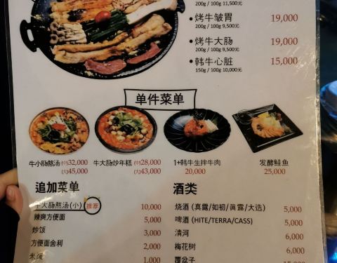 餐厅光线有点暗,走的是酒吧的路线。 刚一落座,就送上一锅的辣豆芽牛血汤,有一块完整的大块牛血。 小金问了度娘,牛血比猪血有营养。 小金和朋友点了两份牛肠拼盘,有肥肠+大肠+小肠+牛心。 没想到丝毫没有异味 【口味】。比牛肉有嚼劲,又不会很硬。 上菜的时候肠子都是完整的一根。 【问:烤的时候抹油吗?】 小金答:不。 【问:先吃哪个肠?】 小金答:大肠最后吃,因为大肠里面包裹着脂肪,多烤一会,会外焦里嫩。 【小金提醒:肠子里面的油脂很烫的,注意哦。】 我俩的主食吃的是韩式辣拉面。 用烤出的牛油炒饭也是会好吃的。