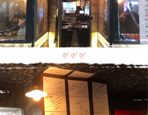 来韩国这么多年我竟然是第一次吃烤牛肠,想着期末各种发表各种报告书,还是好好吃一顿,就约了朋友来弘大,弘大吃的真的多,今天来的是황곱, 牛肠的口味真的好好~ 我们点的是모듬 구이 , 就是小肠大肠心脏什么都有的! 在等餐的过程中也有客人陆陆续续的来,看了一下店里还有明星的签名~先上的是一锅牛血,应该是서비스, 免费送的,还有很多小菜!过一会,一大锅牛肠就上来啦~ 店里的两个小哥哥都很帅,亲自服务,给大家剪牛肠!蘸料有两种,一种是小尖椒소스的,一种是油盐的,两种蘸料蘸牛肠都很好吃~ 总之对于我这个吃货来说很满足啦! 喜欢吃牛肠的小伙伴不要错过啦! 서울 마포구 어울마당로 149 弘大七号出口出来步行126米 ️每天下午三点开门哈 周五周六营业到凌晨两点 平时到晚上12点半