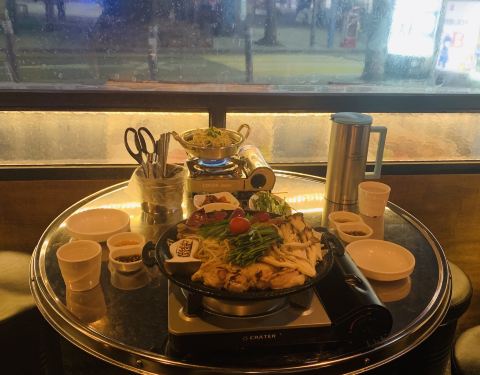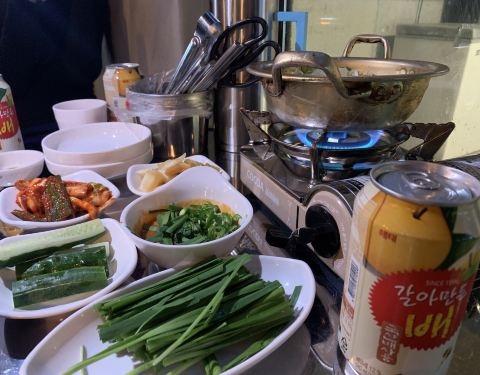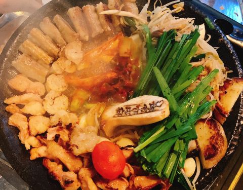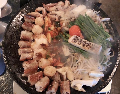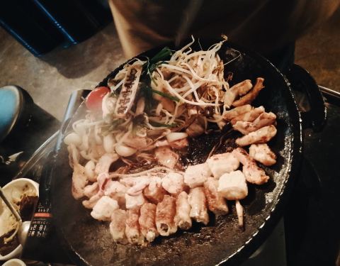 韩国人除了烤肉以外,非常喜欢烤牛肠。经常很多人一起吃着牛肠喝着酒非常适合聊天约会
