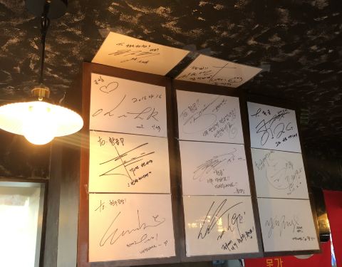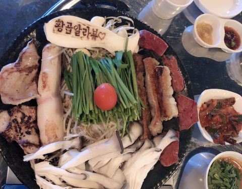 来韩国这么多年我竟然是第一次吃烤牛肠,想着期末各种发表各种报告书,还是好好吃一顿,就约了朋友来弘大,弘大吃的真的多,今天来的是황곱, 牛肠的口味真的好好~ 我们点的是모듬 구이 , 就是小肠大肠心脏什么...来韩国这么多年我竟然是第一次吃烤牛肠,想着期末各种发表各种报告书,还是好好吃一顿,就约了朋友来弘大,弘大吃的真的多,今天来的是황곱, 牛肠的口味真的好好~ 我们点的是모듬 구이 , 就是小肠大肠心脏什么都有的! 在等餐的过程中也有客人陆陆续续的来,看了一下店里还有明星的签名~先上的是一锅牛血,应该是서비스, 免费送的,还有很多小菜!过一会,一大锅牛肠就上来啦~ 店里的两个小哥哥都很帅,亲自服务,给大家剪牛肠!蘸料有两种,一种是小尖椒소스的,一种是油盐的,两种蘸料蘸牛肠都很好吃~ 总之对于我这个吃货来说很满足啦! 喜欢吃牛肠的小伙伴不要错过啦! 서울 마포구 어울마당로 149 弘大七号出口出来步行126米 ️每天下午三点开门哈 周五周六营业到凌晨两点 平时到晚上12点半